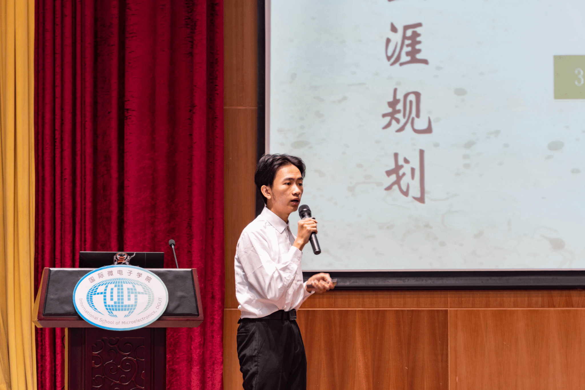 所有选手展示结束后,进入评委总结环节。国际微电子学院党委副书记翁炎泉老师对本次比赛进行总结,他提到经过参加本次比赛,很多同学已经具备主动的生涯规划意识,能够有意识将个人生涯成长与国家战略布局和社会发展需要有机结合,这也表明我院生涯教育与就业指导工作取得了初步的成效他对参赛及观赛同学提出了几点期望,一是希望同学们能够筑牢生涯规划的价值根基,将“报效国家,服务人民”作为生涯规划的初心及职业选择的自觉追求;二是握生涯规划的科学方法,通过主动思考、科学探究,逐步确立自己的职业发展目标,勾画成长路线图;三是迈出生涯规划的实际行动,持续提升综合素质能力,为从事未来理想职业打下坚实基础。