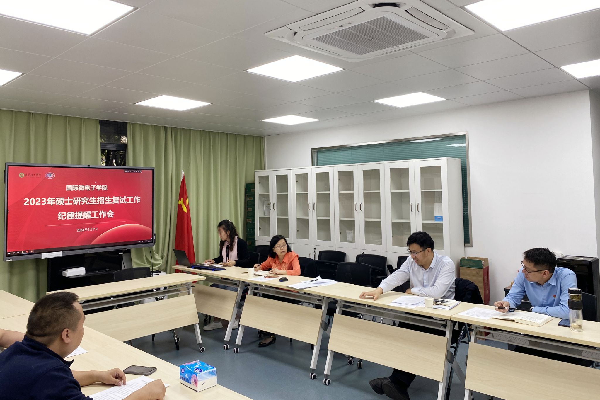 2023年3月9日下午16时,国际微电子学院召开2023年硕士研究生招生复试纪律提醒工作会,学院党委书记任斌、学院副院长卢贵主、学院党委副书记翁炎泉、研究生复试命题教师和工作人员参加了会议,会议由学院党委副书记翁炎泉主持。