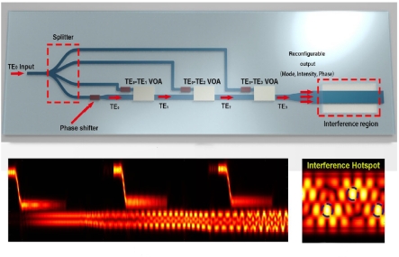 并基于此提出了一个复杂干涉模式发生器。通过对不同模式的级联模式变换器,可以任意混合输出波导中的模式百分比,从而在多模波导中实现不同的模式的干涉,并利用这个器件实现了一个可重构的片上光镊,能够操纵纳米级粒子并实现几种简单运动。