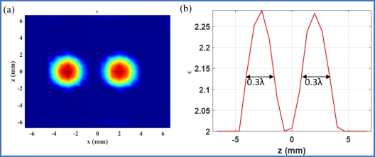 (1)2020年,提出利用涡旋电磁波对碳纤维复合材料内部损伤进行反演检测。研究结果表明,对于二维目标,反演精度可达1/10波长,三维目标的分辨率也可达到1/2波长。图8给出了涡旋电磁波照射下碳纤维复合材料内部多目标二维反演结果,即当采用12个OAM模式时,反演结果可以清晰的分辨出两个相互间隔为0.3个波长的目标,并且可以得到目标的尺寸和介电常数信息。