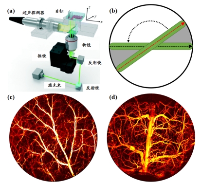 图13 (a)旋转式扫描系统反射示意图,(b)旋转式扫描方法示意图,(c,d)采用该光学分辨率光声显微成像系统获取的小鼠耳朵血管与脑部血管网络的图像结果。