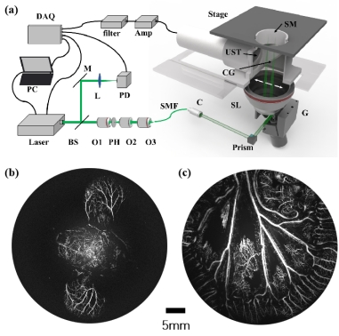 图14 (a)旋转式大范围扫描系统示意图,(b)采用该大范围成像系统小鼠脑部与耳部血管网络影像结果,(c)该光学分辨率大范围成像系统获取的小鼠肠系膜血管网络的图像结果。