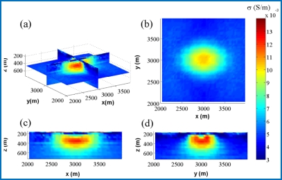 (4)2019年,提出将DBIM反演方法应用于低频电磁勘探的三维电导率重建,如图12所示,算法可以重建出空间中矿体的电导率分布图。由图中可以看出,算法很好的重建出了地下异常体的电导率分布。将电磁场积分方程的正演和反演方法应用于航空电磁方面,并将变形波恩迭代反演方法(DBIM)应用于实际的航空瞬变电磁探测中。得到了实际的三维航空电磁的电导率成像图,这将为本项目提供坚实的理论基础和工程经验。