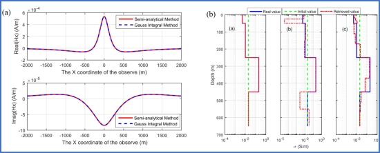 (3)2018年,提出了基于DBIM的反演算法可以快速、准确的反演出地下电导率的分布情况,图11所示为DBIM反演算法与Occam反演方法结果对比图,反演的模型都为四层电导率模型。反演结果显示:DBIM反演方法比奥克姆反演方法(OCCAM)更加接近真实值,同时也更加准确。