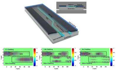 2023年在硅基平台上设计了从TE0到TE1、TE2和TE3的多模可调光衰减器,在400度的温升范围内实现了模式输出功率从0.4-96.4%的无级调节。在基于亚波长光栅的定向耦合器中引入TiO2作为包层材料,以改变折射率。通过在波导上施加不同的温度,多模波导和SWG 的色散曲线可以独立定制,因此可以在不改变波导几何形状的情况下改变耦合系数,实现定向耦合器耦合效率的灵活调控。