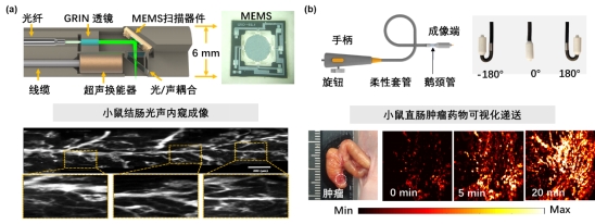 1.在光声内窥探头内部构建二维扫描机制,研发了无外部扫描的光声内窥镜,并成功应用于鼠直肠血管网络成像与腹腔器官药物可视化递送中,相关成果发表于J. Biophotonics, 15, e202200116, 2022; Opt. Lett., 42, 4615, 2017。