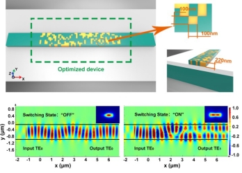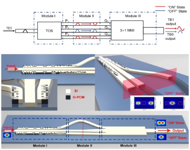 申请人提出了一种基于硅和O-PCM 混合基础设施的超紧凑可切换模式变换器,并使用目标导向的逆向设计方法来构建该器件,设计了一个由硅和GeSe 材料组成的原型。当GeSe 的状态在非晶态和晶态之间切换时,输入波导的模式TE0 保持不变或转换为TE1 模式。其面积为0.9×5 μm,在1535-1565 nm的波长范围内,TE0-TE0和TE0-TE1 输出过程的插入损耗分别小于1.3 dB 和1.6 dB,串扰小于-11.7 dB 和-12.4 dB。