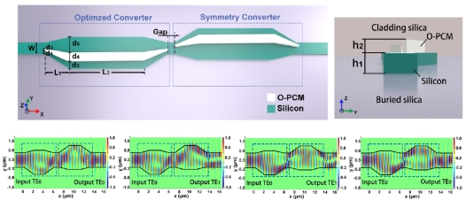 2019年在硅和光相变材料混合超结构的平台上提出并设计了一个宽带、非易失性的片上可调谐模式变换器。通过引入能提供足够大的折射率变化的光学相变材料,可以赋予超结构可调谐的功能,并保持紧凑尺寸的优势。当TE0模式被输入到该器件时,其特征可以选择性地切换为保持原始模式或在输出端口转换为另一个模式TE1。