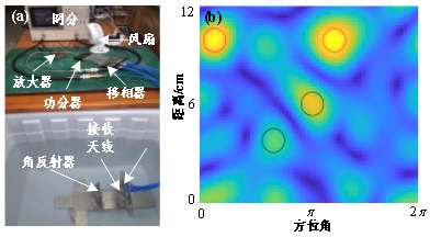 (2)2020年,开展了涡旋电磁波水下角反射器二维成像原理性实验验证实验。实验场景如图10(a)所示,接收天线放置在天线阵列的中心位置。于快速傅里叶变换方法,得到24cm×2π的图像,如图14(b)所示,并将其离散化为64×64个成像网格。从图中我们可以看出,两个角反射镜(红圆反射镜)的目标均可以被有效地识别出来,两个靶点的位置分别约为(10cm,0.205π)和(10cm,1.22π),与真实位置较为接近。同时,图像的距离分辨率约为4cm,方位角分辨率约为0.32π,与理论值3.4cm和0.3π非常接近。