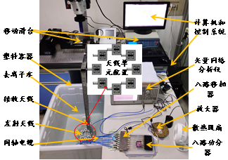(2)申请人采用水作为同轴匹配结构的填充介质,在2.1-4GHz的宽带范围内实现水下电磁波的产生。基于此,组建八阵元宽带阵列天线,通过对不同的阵列天线单元馈入不同相位分布的激励信号,在2.1-4GHz的宽带范围内,实现水下携带OAM模式-3、-2、-1和0涡旋电磁波的产生,天线实验系统图及实验结果如图19所示。基于所设计的水下宽带阵列天线,申请人进行了水下角反射器二维成像实验,如图7所示。