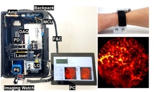 3.通过对光声成像系统设备和成像端口的小型化设计与集成,研发了一款适用于人的可穿戴光声手表(Opt. Lett. 49(6), 1524, 2024)。该光声手表可以根据被试者皮肤厚度适应性地改变成像深度,从而可以更好的观察皮肤微血管结构网络,且能够通过成像端口上屏幕预显示提供实时图像反馈。实验结果表明这款手表能够检测到血流的波动,在健康监测、早期疾病筛查、运动康复和慢性病管理等方面具有巨大的应用潜力。如图25所示。