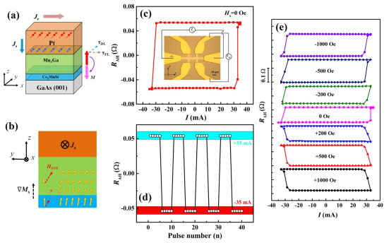 为了实现SOT驱动垂直磁矩的确定性翻转,通常需要施加平行于电流方向的面内磁场。这一辅助磁场的作用是用来打破垂直磁化矢量相对于面内自旋极化电子的对称性。本团队利用分子束外延设备在GaAs衬底上制备了高晶体质量、良好垂直磁各向异性的Co2MnSi/D022-Mn3Ga双层膜。通过密度泛函理论计算表明,该双层材料界面处存在显著的磁化梯度,从而诱导产生强烈的层间Dzyaloshinskii−Moriya相互作用(DMI)。这种对称性破缺使得在霍尔桥器件中实现了高效的零场SOT翻转。直流电流下反常霍尔曲线的横向偏移证实了零场下较高的SOT效率χSOT。此外,通过分析SOT翻转行为对平面磁场Hx的依赖性,发现DMI有效场Hg-DMI的强度高达60 Oe。这项研究证明利用面外磁化强度梯度实现全电学SOT翻转具有可行性,并为下一步通过增大组分变化范围或设计磁性双层膜,从而构建更高磁化强度梯度以实现零场下高SOT翻转比例奠定了初步实验基础。