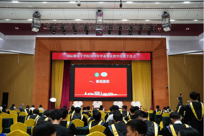 6月20日上午,国际微电子学院2025年学士学位授予仪式在松山湖学术会议中心多功能厅隆重举行。仪式由国际微电子学院副院长赵晓芳老师主持,出席人员有国际微电子学院党委书记、执行院长任斌、党委副书记翁炎泉、副院长张光旻、电子系主任杨阳、微电子系主任李媛、办公室主任张睿、实验室主任黎山峰,出席典礼的还有2025届各班班主任、全体辅导员、办公室人员以及我院2025届毕业生。