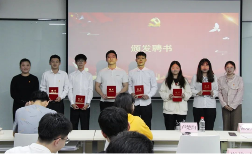 随后是大会的第三项议程——卢楚韵老师和陈亚莉老师为党建办同志颁发聘任证书,并合影留念。