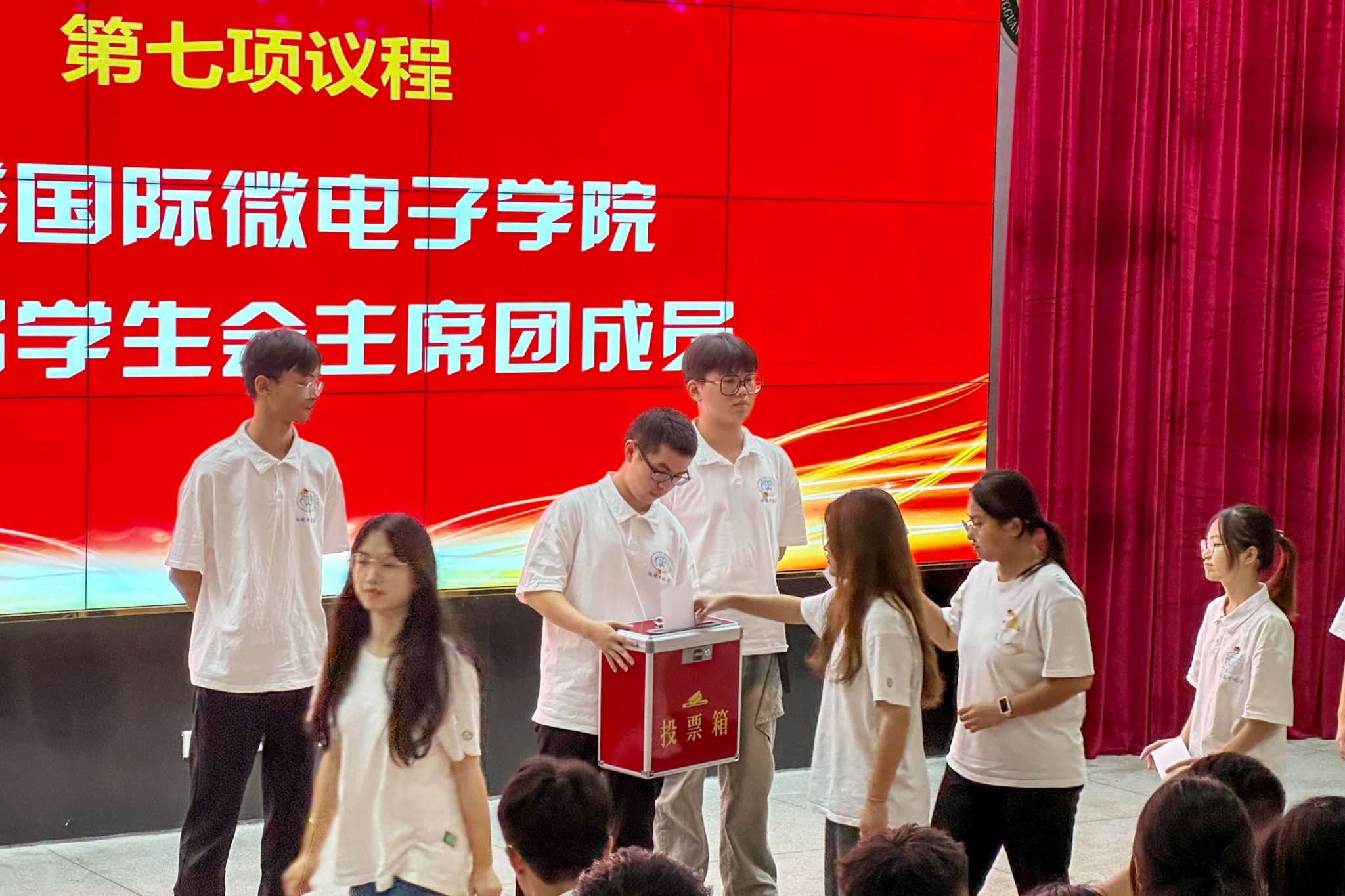 大会代表们听取了《国际微电子学院第二届学生会主席团候选人名单》的宣读,并观看了候选人竞选展示。大会采取无记名、差额投票的方式,选举产生了国际微电子学院第二届学生会主席团成员。
