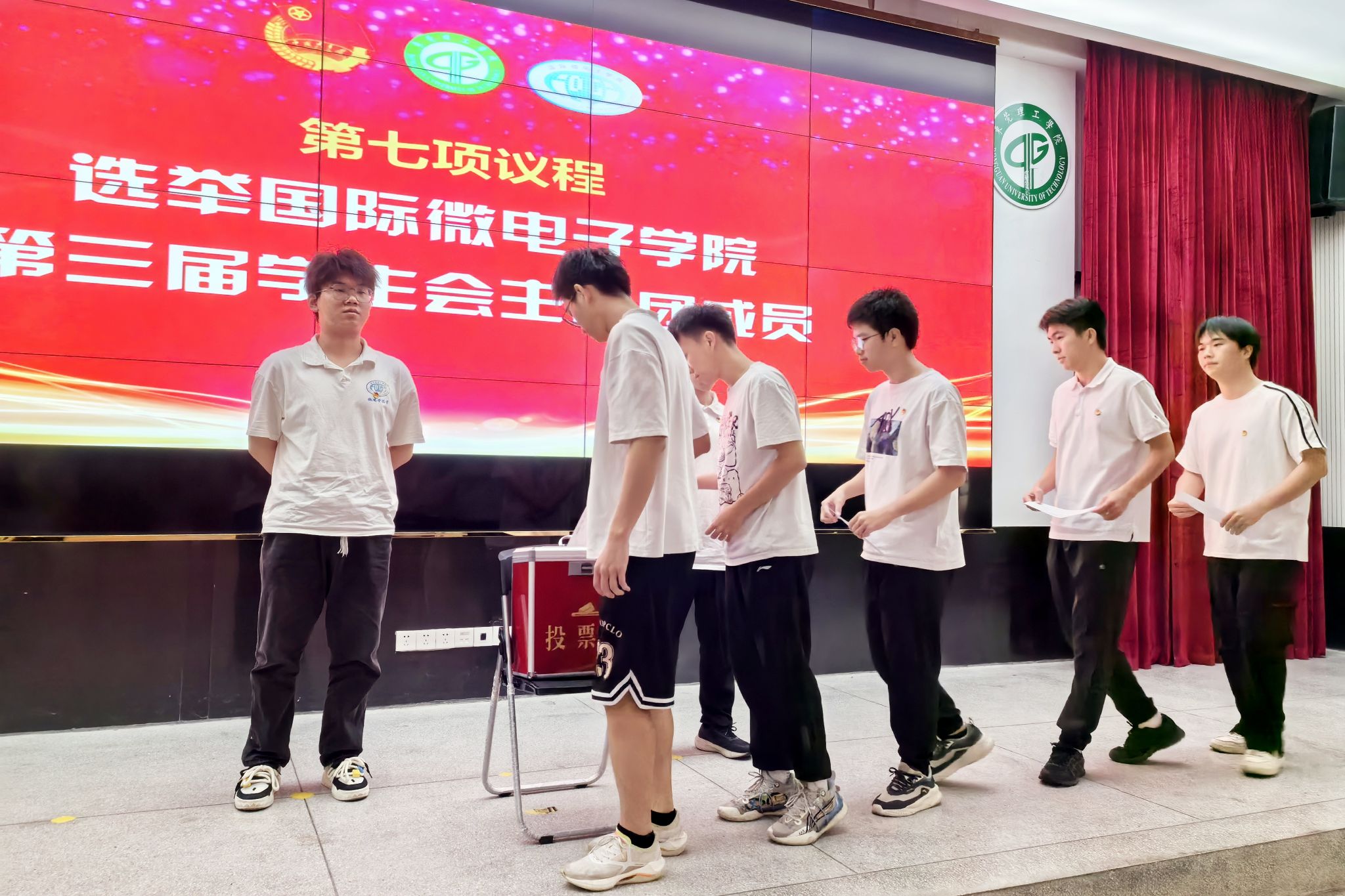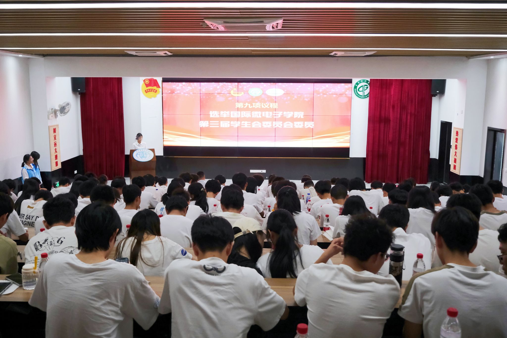 大会代表们听取了《国际微电子学院第三届学生会主席团候选人名单》的宣读,并观看了候选人竞选展示。大会采取无记名、差额投票的方式,选举产生了国际微电子学院第三届学生会主席团成员。