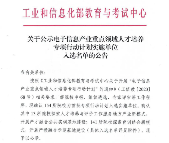 2024年3月18日,工业和信息化部教育与考试中心(以下简称工信部)发布公告,共有154所院校为首批专项行动计划入选实施单位,其中13所拟建产才融合公共实训基地,141所拟建产教融合示范基地。