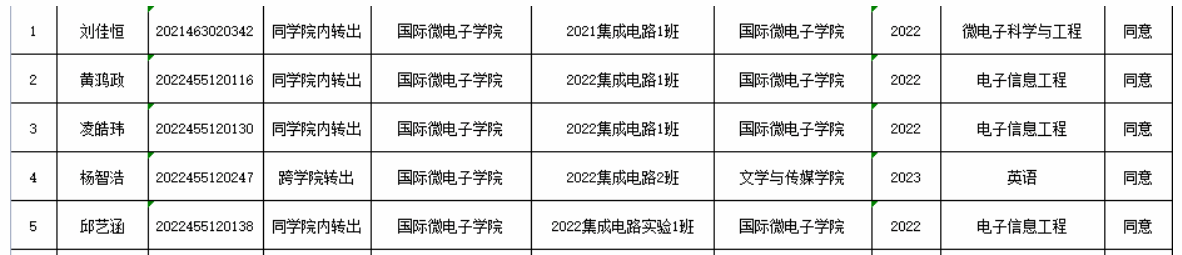经国际微电子学院学位评定委员会审查,刘佳恒等5位同学符合国际微电子学院转专业转出要求,拟同意刘佳恒等5位同学的转专业申请。现予以公示,具体信息如下:
