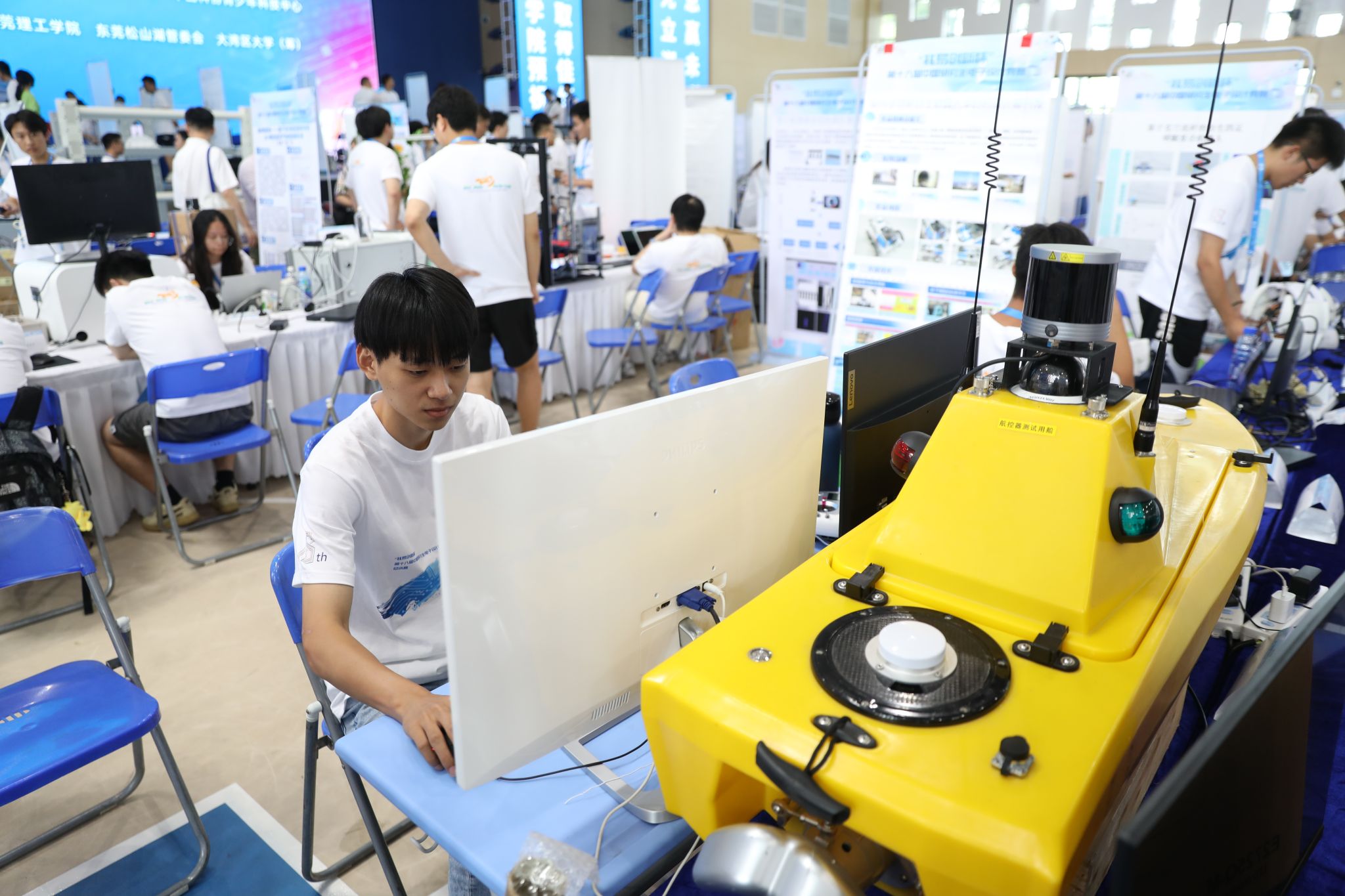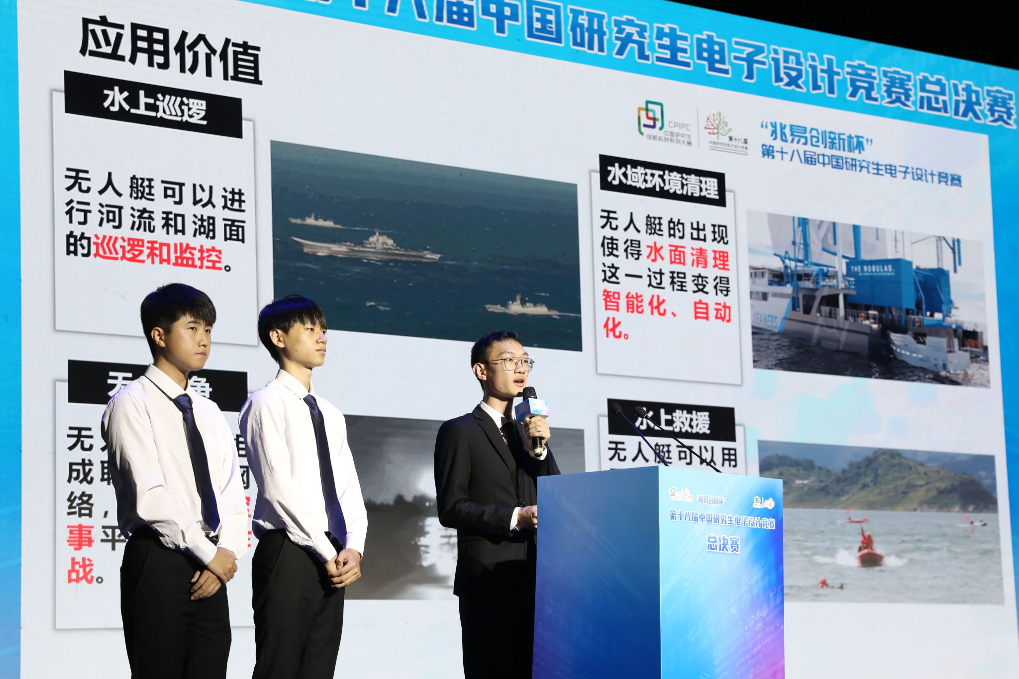 该队的参赛作品为“无人艇集群控制系统”。无人艇作为一种具备自主运行能力的水面艇,具有体积小、总价低、隐蔽性好、航速高、机动灵活等优点。相比于单艇势单力薄,无人艇集群能够执行各类复杂的水上任务,应用前景更加广阔。