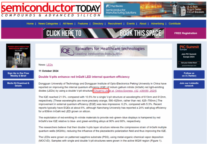 近日,yl23411永利集团国际微电子学院和北京大学东莞光电研究在Optics Express 发表InGaN红光发光二极管的研究成果被国际知名半导体杂志Semiconductor Today专题报道。文章中报道了采用双V坑结构提高InGaN红色发光二极管(LED)的内部量子效率(IQE)的最新研...